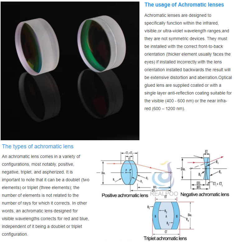 - Material: Optical glass (Crown & Flint doublet)