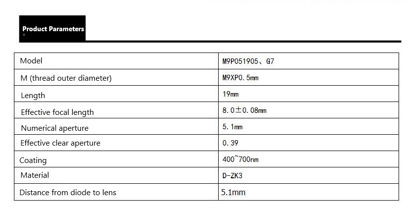 G7lens 7mm diameter collimator lenses focal length 8mm pitch M9*P0.5mm red laser collimatpr focusing lens