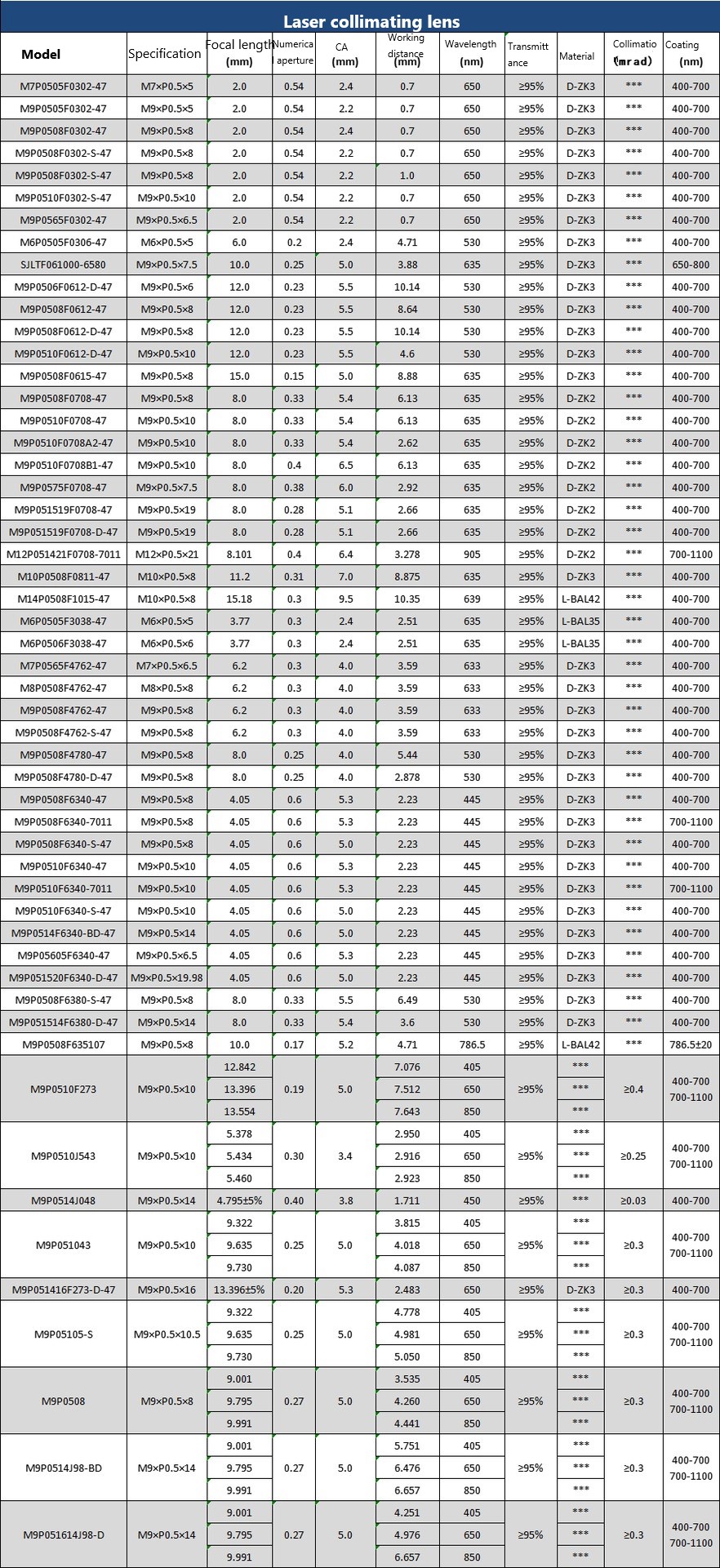 For Collimating lens, the focal length we have 3.77mm,4.02mm, 4.39mm,6mm,6.2mm ,6.5mm,8mm, 8.3mm, 9.8mm, 10mm,11.2mm and 12mm.