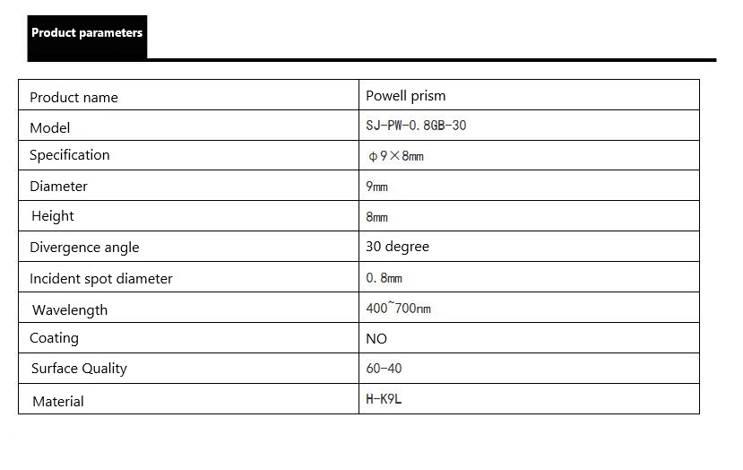 Spot diameter 0.8mm divergence angle 30 degrees powell prism 9mm diameter Powell lenses optical prism factory custom