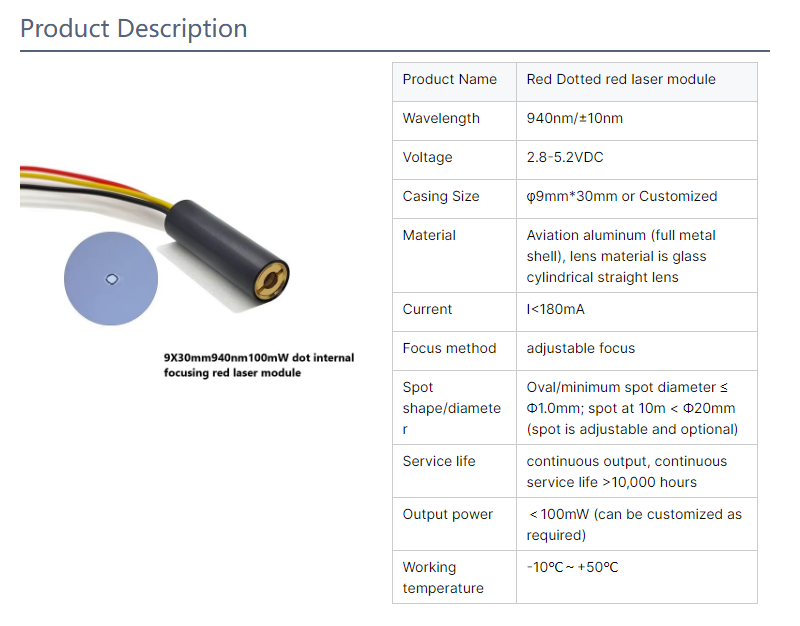 9X30mm940nm100mW laser module internal focus dot laser module 940nm100mW laser module 940nm dot laser module 100mw laser module customized Inquiry Send Email